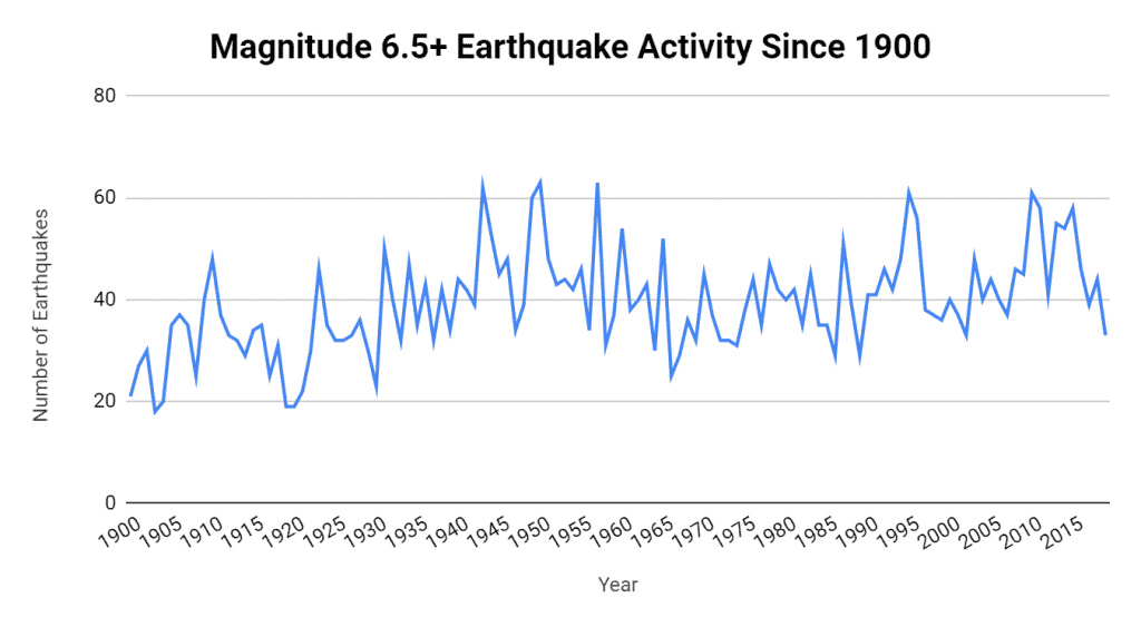 The following graph illustrates magnitude 6.5 and greater earthquake activity each year since 1900.